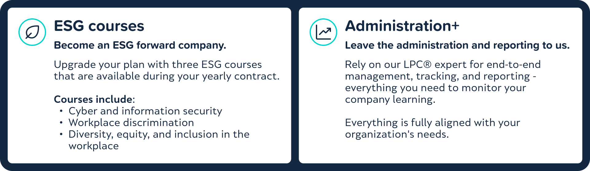 The various plans look great, but you want something more? You can always upgrade your LPC® Spark plan with various add-ons. Current add-on packages include a course library upgrade with ESG educational programs and additional administrative help with the Administration+.