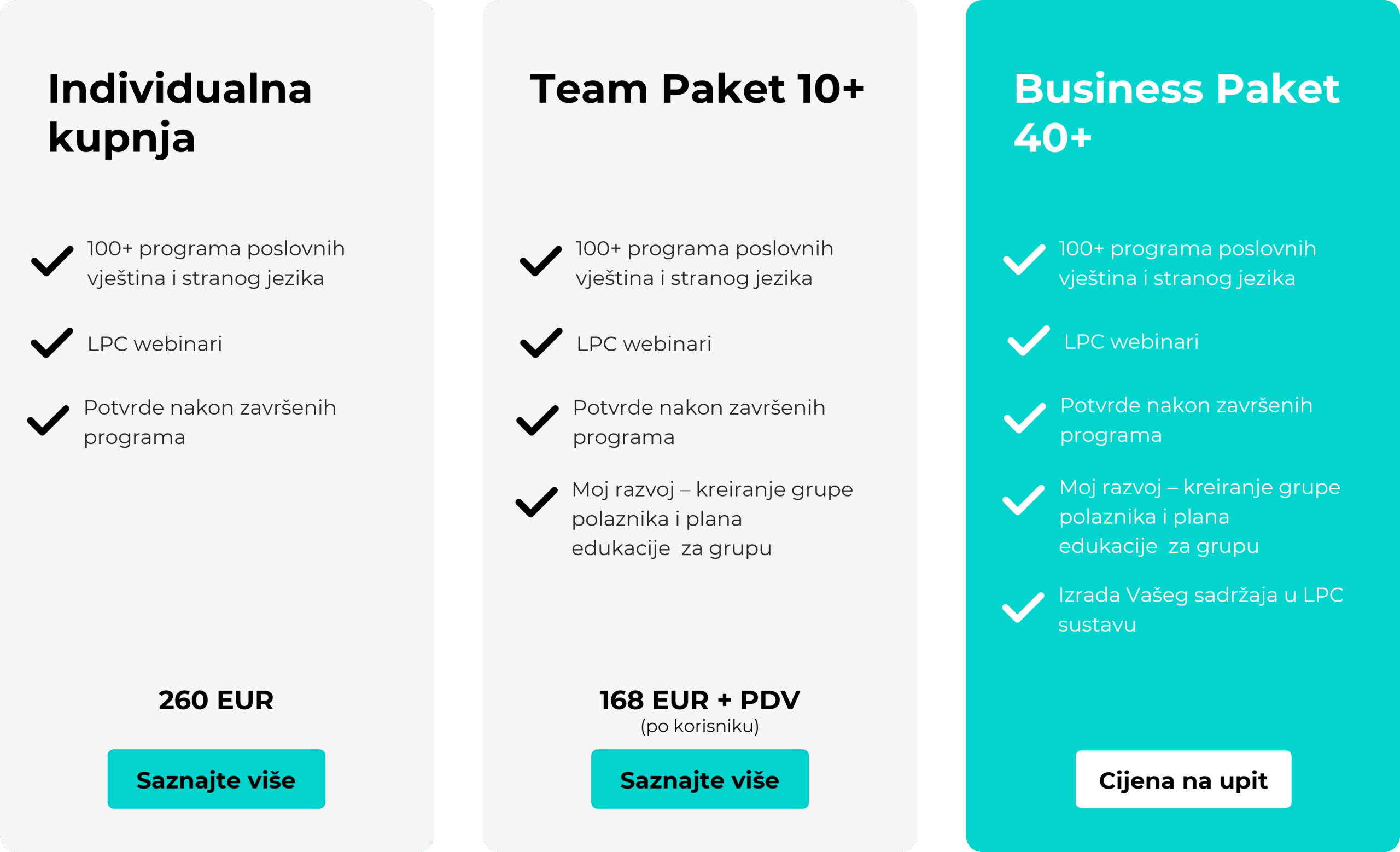 Team Paket 10+grupa od 10 i više polaznika (168,00 EUR + PDV) 210,00 EUR po korisniku |