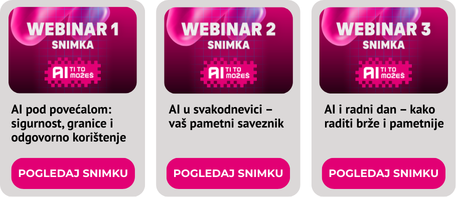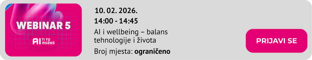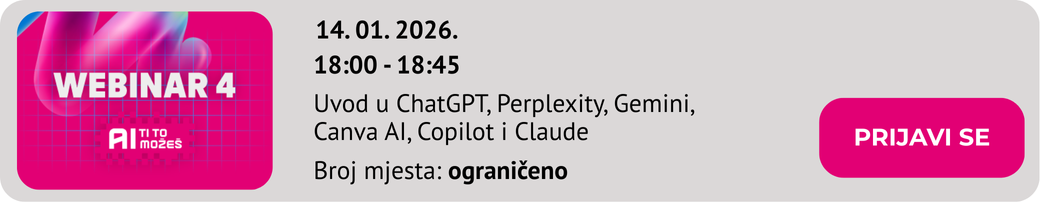 Kupi online edukaciju „AI ti to možeš“ za 0,00 EUR u kojoj te čekaju snimke održanih webinara, mogućnost dobivanja certifikata te webinari u najavi na koje se možeš prijaviti.