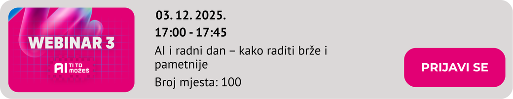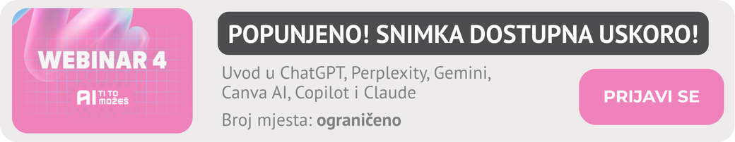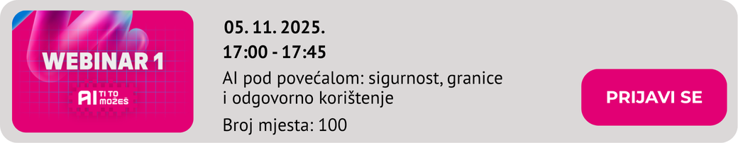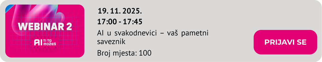 Kupi online edukaciju „AI ti to možeš“ za 0,00 EUR u kojoj te čekaju snimke održanih webinara, mogućnost dobivanja certifikata te webinari u najavi na koje se možeš prijaviti.