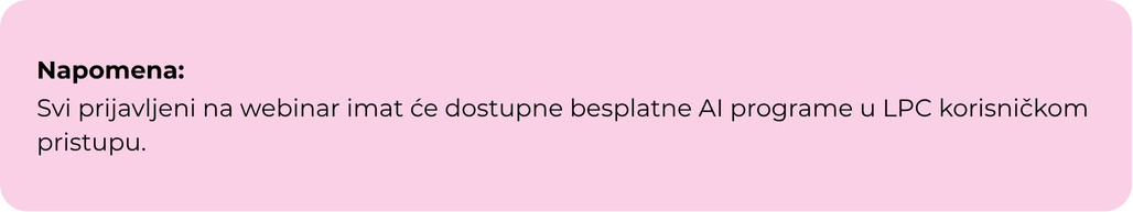 Nauči kako AI može olakšati posao, ubrzati svakodnevne zadatke i otvoriti nove prilike – na način prilagođen baš tebi. Nakon odslušanog webinara i uspješno završene provjere znanja u LPC sustavu, možeš dobiti i certifikat o AI edukaciji – potpuno besplatno.